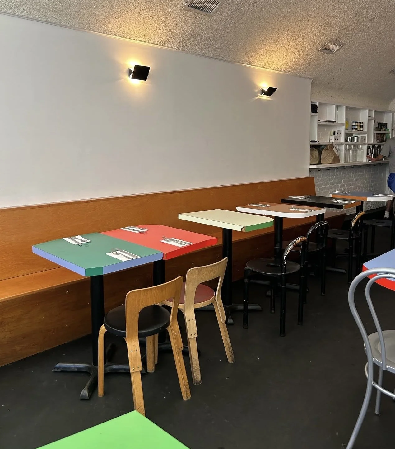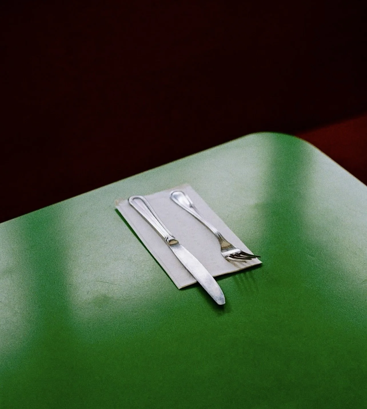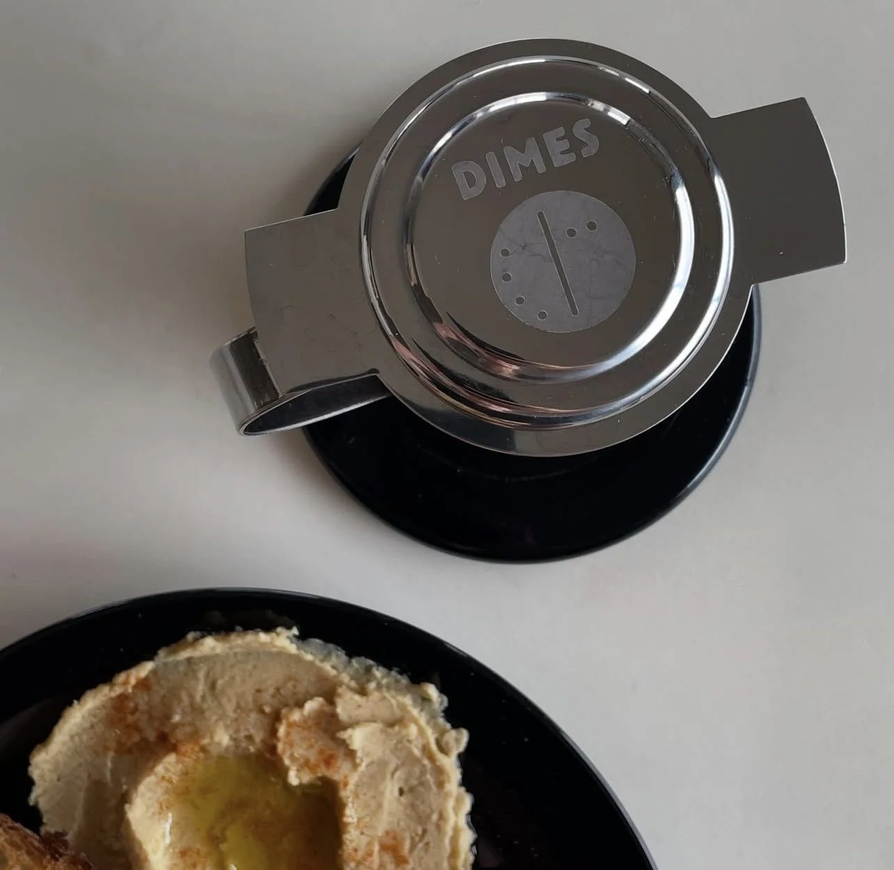 Page of a menu with a beige background and red borders, titled 'Dimes'. The menu features a black line drawing of a margarita glass with a lemon slice, labeled 'Starters', with items: 'Wheatgrass margarita' and 'Salmon in seed crust with wild rice, butternut squash, and green tahini'. Below a section titled 'Main Course' with a paragraph about dining at Dimes in Chinatown, and a black line drawing of salt and pepper shakers, and a fork and knife. Another section is titled 'Dessert' with a paragraph about a casual day, and a black line drawing of a New York Yankees baseball cap. At the bottom, the address '143 Division St and 49 Canal St. New York.', and the Instagram handle '@dimetimes'.