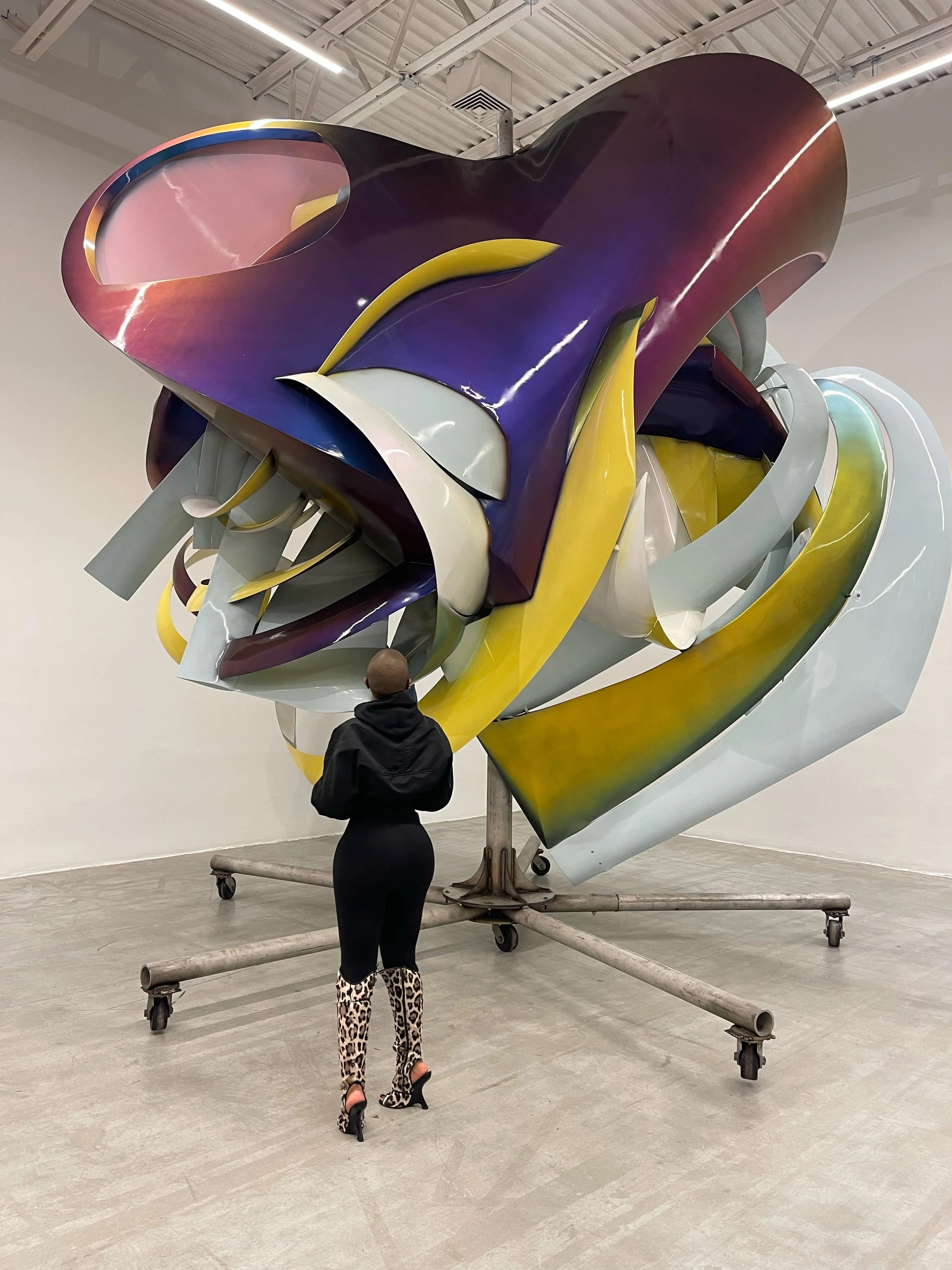 Event flyer for Jeffrey Deitch Gallery featuring a hand-drawn palette with brushes, a sketch of an art gallery entrance, a leopard print high heel shoe with stars, and text about an exhibition, main course, and dessert at 76 Grand St., New York.